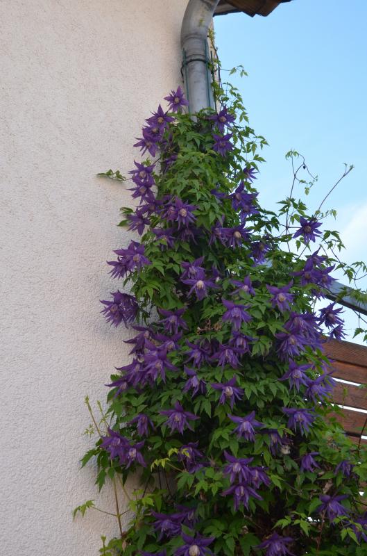 Ich bringe es nur gar nicht recht uebers Herz die neugierig rankende einzige Triebspitze jetzt nach der ersten Bleute (ca. 4 Blueten) einzukuerzen. Dann waere es wieder sooo weit bis zum Zaun.