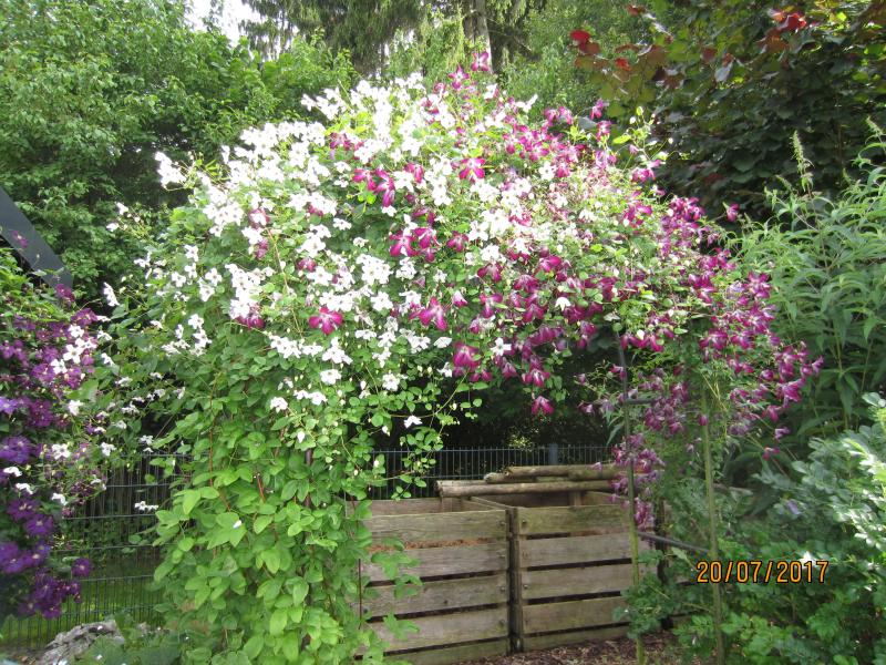 Ich habe am Zaun (einmal neben einem Haselstrauch) seit einigen Monaten zwei Viticellas (Scented Clem und Betty Corning). Ich habe gelesen, dass ich sie im Fruehjahr auf 30-50cm schneiden soll. Bei der Scented Clem hiess es, ein Rueckschnitt nach der ersten Bluete sei auch gut und sorge fuer einen buschigeren Wuchs.