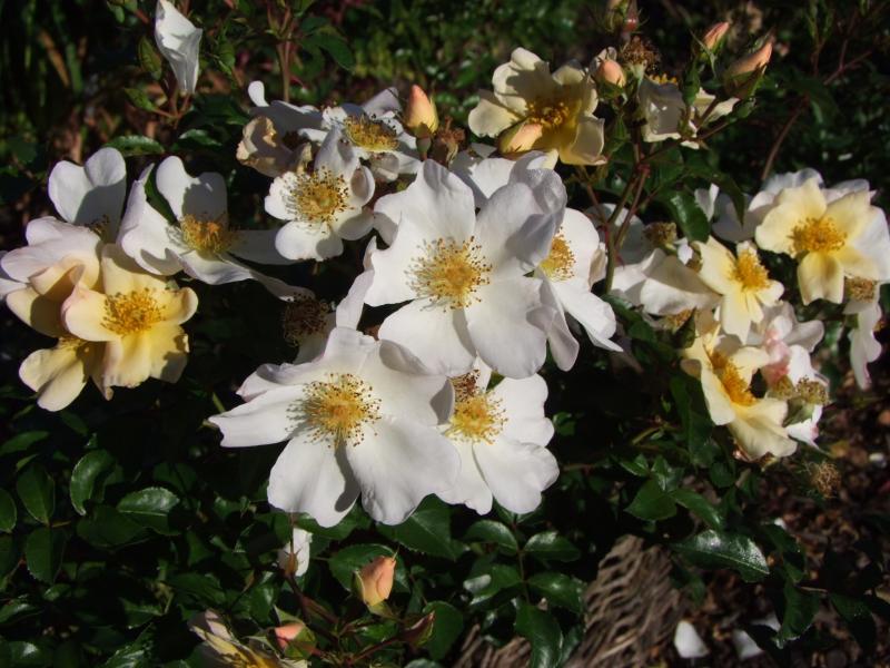 'Pretty Snow'eine Kleinstrauchrose neueren Datums von Meilland.Die Bienen sind verrückt nach ihr.Dieses Foto ist schon drei Jahre alt.Inzwischen versucht sie die angegebenen Ausmaße von etwa1,10m Höhe und Breite zu sprengen.Vor allem in der Breite.Sie schiebt lange vollbesetzte Blühtriebe in einem fort.Man muss sie ein wenig im Auge behalten und Verblühtes ausschneiden,sonst bildet sie immer gleichzeitig viele,kleine Hagebutten.Honigduft.