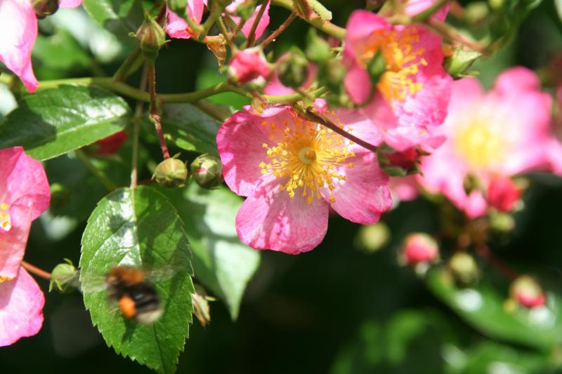 Das ist mein Bienenfutter für den ganzen Sommer. Die Juanita vom Kordes, sie hat kleine offenen Blüten und blüht wirklich bis zum Frost. Da kommen die ganzen Bienen vom Dorf zusammen, da summt und brummt es den ganzen Tag, eine wahre Freude.