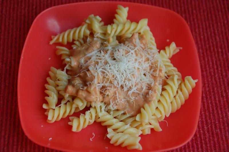 Hier gab es Spirellen mit Standardsoße (pass Tomaten, Frischkäse, Frühlingszwiebeln, Leinöl, Knoblauchpulver, Salz, weißer Pfeffer) und Parmesan. Essen 2 war Polenta mit Tomatensoße (pass Tomaten, Frühlingszwiebeln, Leinöl, Knoblauchpulver, Salz, weißer Pfeffer).