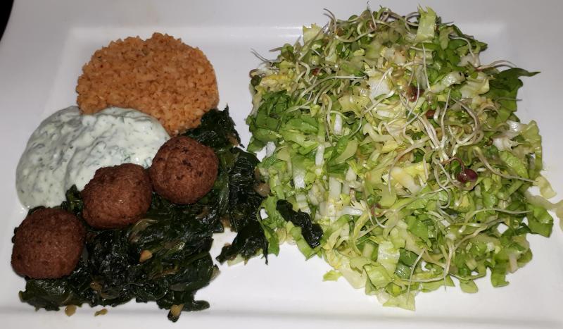 Blattspinat, Bulgur, Seitanklößchen, Bärlauch-Koriander-Joghurt und Endiviensalat