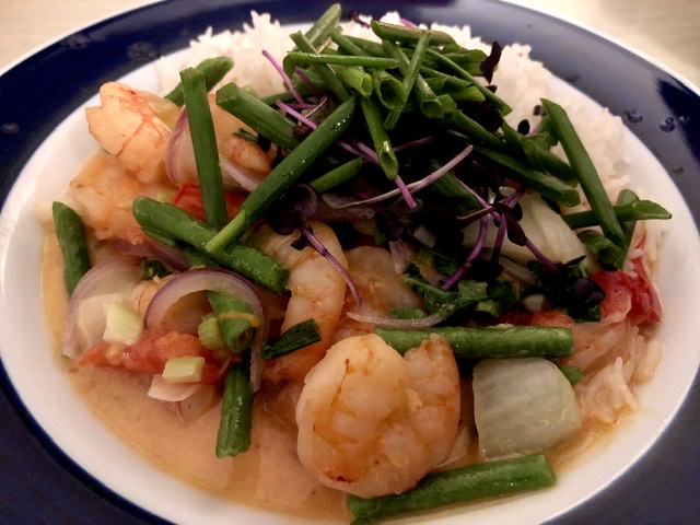 zur einweihung des ersten reiskochers unseres lebens: rotes thai-curry mit garnelen