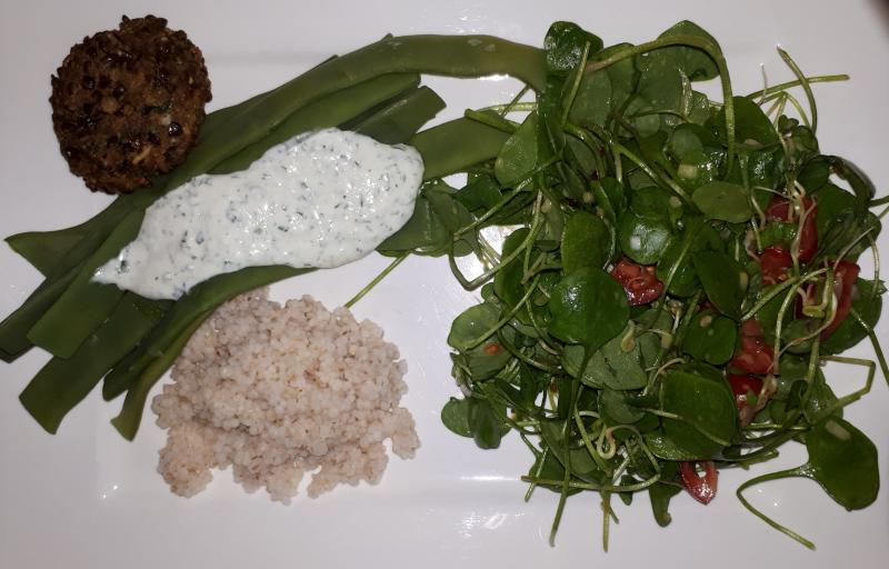 Linsenbratlinge, grüne Bohnen mit Koriander-Bärlauch- Quark und Graupen. Dazu gab es Postelein mit Tomaten und Sprossen.