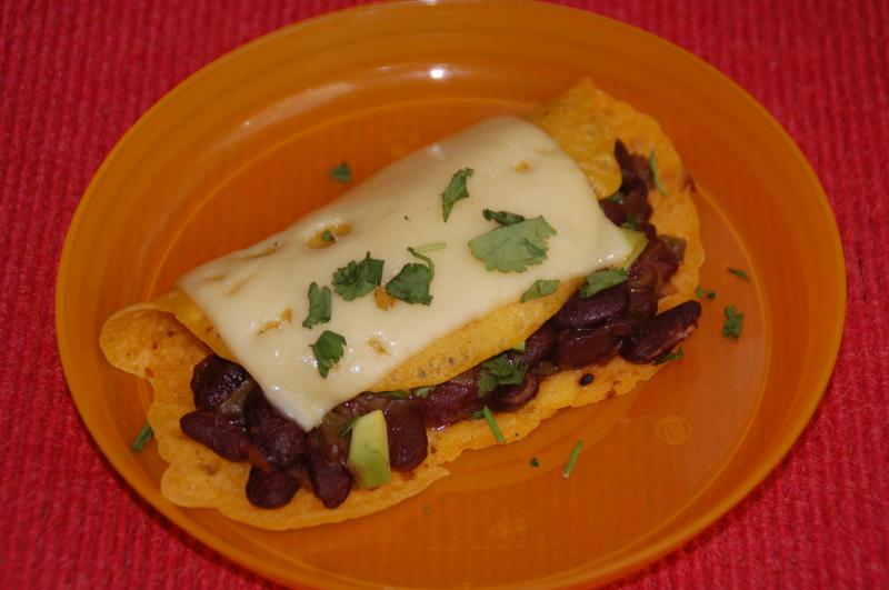 Maistortillas mit Kidneybohnenfüllung (Kidneybohnen, grüner Paprika, Zwiebeln, Knoblauchpulver, Paprikapulver, Öl, frischer Koriander, Avocado) und Emmentaler überbacken