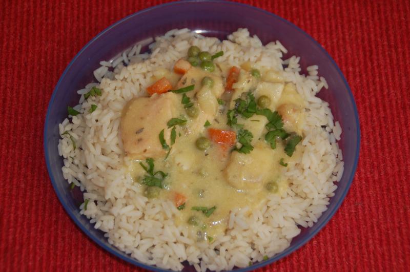 Heute gab es wieder etwas, bei dem sich alle Takis (und großen Kinder) einig waren :D: Reisring mit Fischfrikassee (Lachsfilet, Victoriasee-Barsch, Zander, Zitronensaft, Salz, Butter, Maismehl, Gemüsebrühe, Möhre, Zwiebel, Erbsen, Kapern, Weißwein, eingesalznes Selleriegrün, Paprikapulver, Eigelb, Koriandergrün)