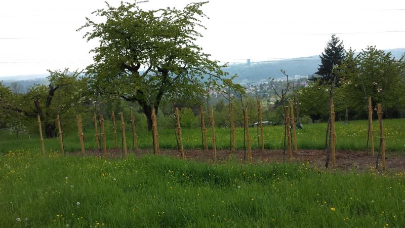 Kirschwiese mit Strehles Kirsche, Pflanzjahr vermutlich 1942, rechte Reihe ganz hinten.