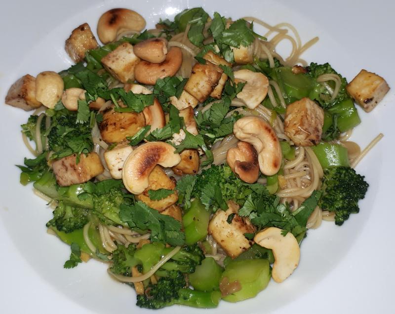 Mie-Nudeln mit Brokkoli, Tofu und Cashewkernen, grüner Salat