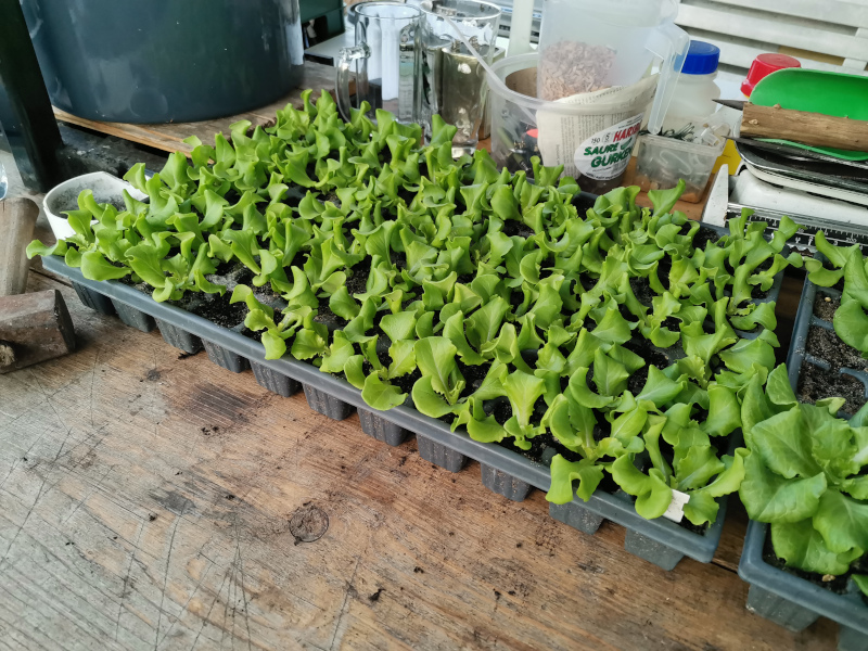 Hier steht der 2te Satz zum abhärten auf der Terrasse. Diesmal kein Mix sondern Kopfsalat und nicht pikiert, sondern ein Korn pro Topfzelle. Hat sich bewährt wenn das Saatgut ok ist.