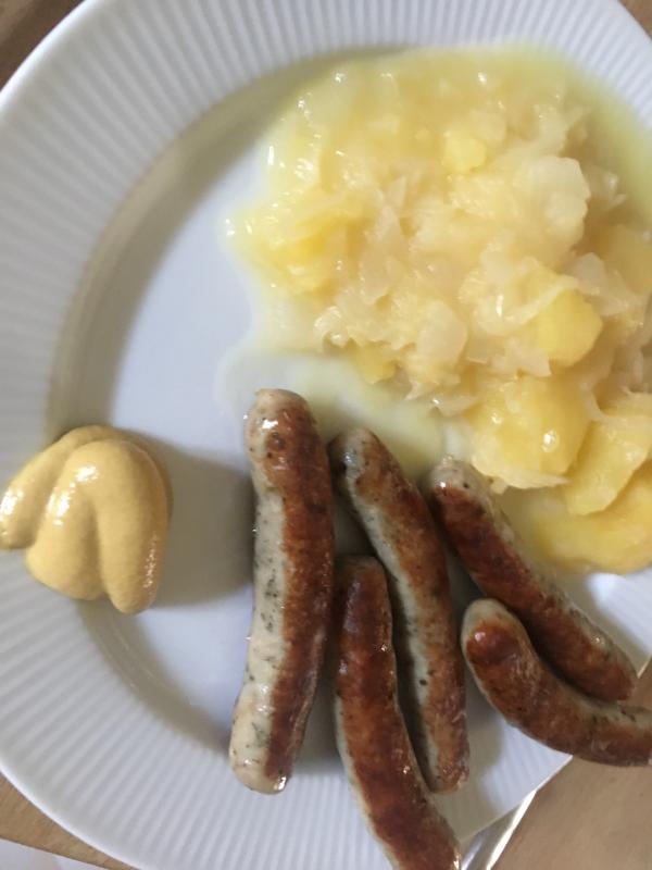 Rostbratwürstel, Erdäpfel, Sauerkraut.