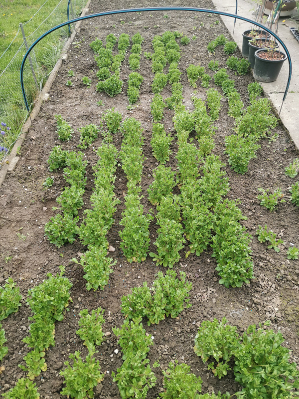 Der Feldsalat geht jetzt hier in die Blüte, zumindest der Teil, der im Kleintunnel mit Lochfolie stand.