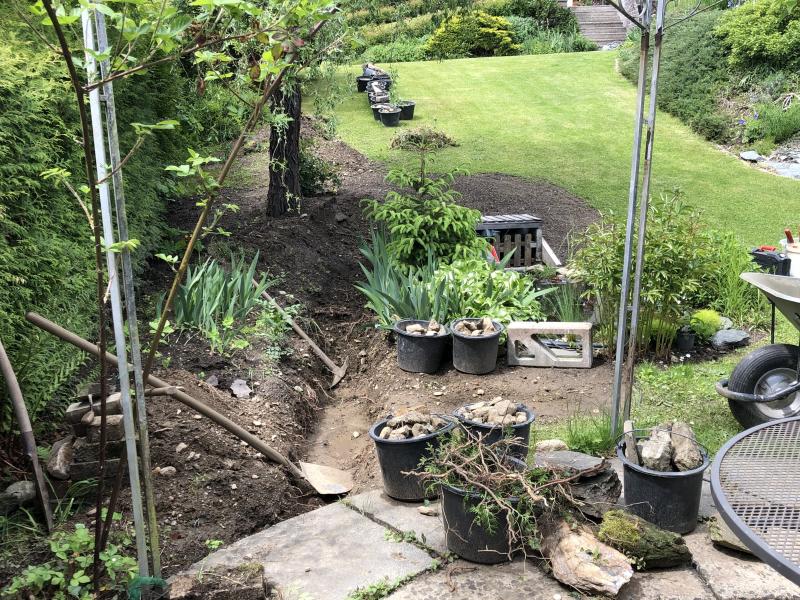 GG verlegte den Schacht für die Teichpumpe ( das Holzgebilde im Hintergrund) auf die andere Seite, ich wollte es zu einem Sitzplatz umfunktionieren.
