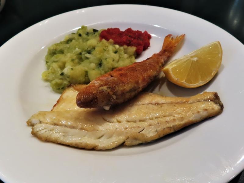 Vom Wolfsbarsch blieb nach dem Filetieren etwas wenig übrig, deshalb kamen noch die letzten drei Streifenbarben mit. Dazu gab es Kohlkartoffelstampf (Kohl, der Letzte) und knuspriges Brot.