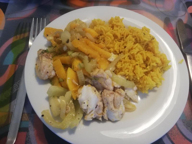 Skreiragout auf Fenchel und Kürbis (Melonette Jaspée de Vendée) mit Kurkumareis.