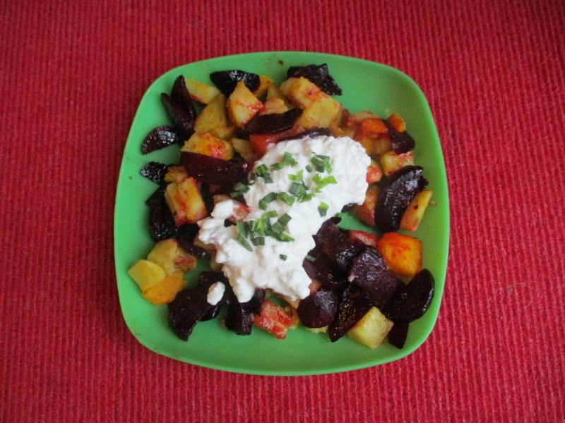 Hier gab es lecker-schlecker: rote Bete (in Kräuteröl und Salz gebraten) mit Bratkartoffelkürbis (mit Schmalz, Salz, Pfeffer, scharfem Paprikapulver), Krümelquark und Knoblauchgrün.