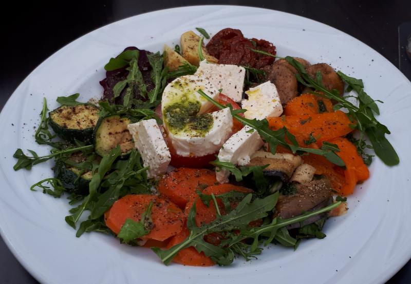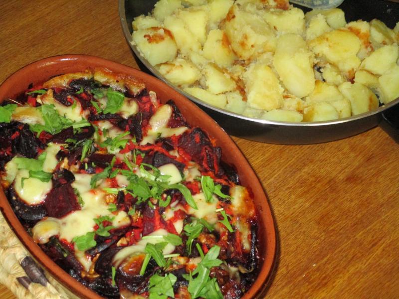 Heute gebackene rote Bete mit Mozzarella, Walnüssen und Ruccola. Dazu ein paar Bratkartoffeln.