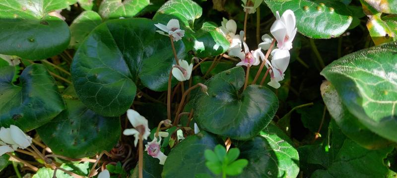 Letzte Cyclamen hederifolium in Haselwurzpolster; vor 15 Jahren aus Samen gezogen