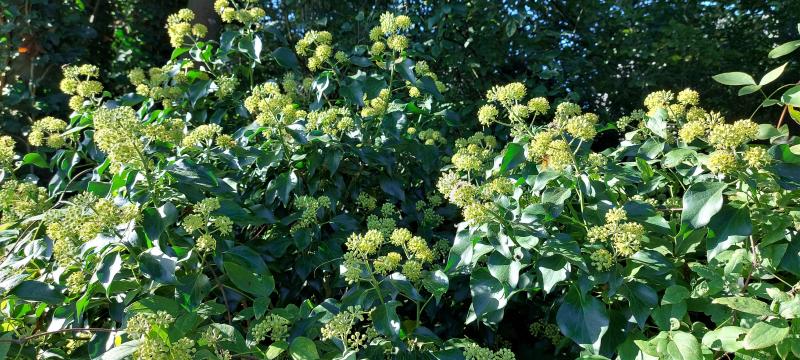 Blühender Efeu in Altholzhaufen; Insektenmagent; im ungestörten Altholzhaufen darunter Nashornkäfer etc.