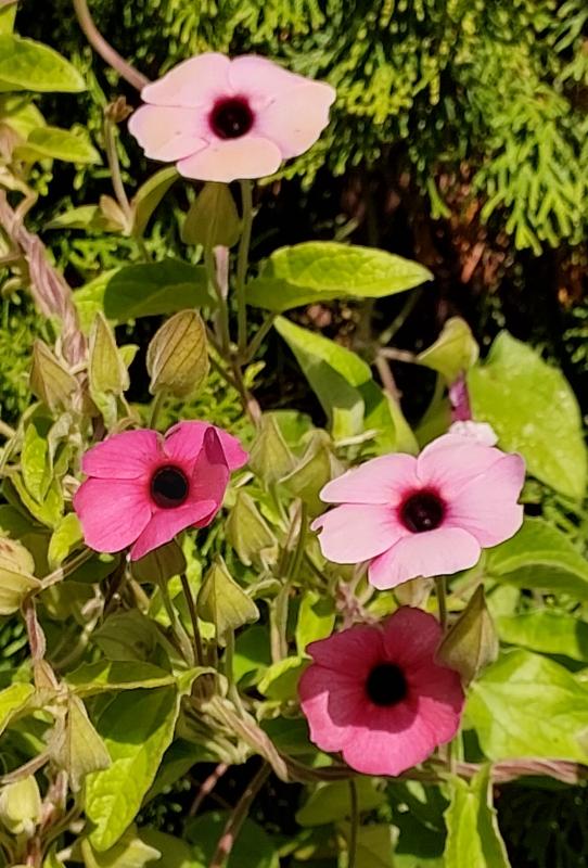 Die schwarzäugige Susanne nun 3 m hoch, bedeckt das ramponierte Nadelgeholz.