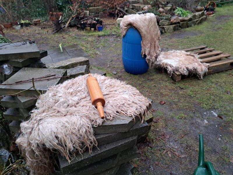 Hier ging es mit den Fellen weiter. Habe sie ausgewrungen und versucht, nochmal die Rückseite abzuschaben. Ging aber nicht besser. Na, mal sehen, was zum Schluss abzuschleifen ist. Bei einem der Felle habe ich die Wolle versuchsweise, im vernieselten Garten, mit Shampoo eingeschäumt. Eher eingerieben, mit Schaum war da nicht viel. Ich hoffe, dass das Fell später etwas sauberer ist. Bei einem nächsten Versuch werde ich die Felle vor dem Gerben kräftig waschen und säubern. Vielleicht ;D.