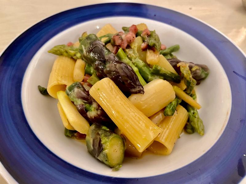 derweil gab es hier gartenspargel carbonara, mit einer handvoll rigatoni di gragnano