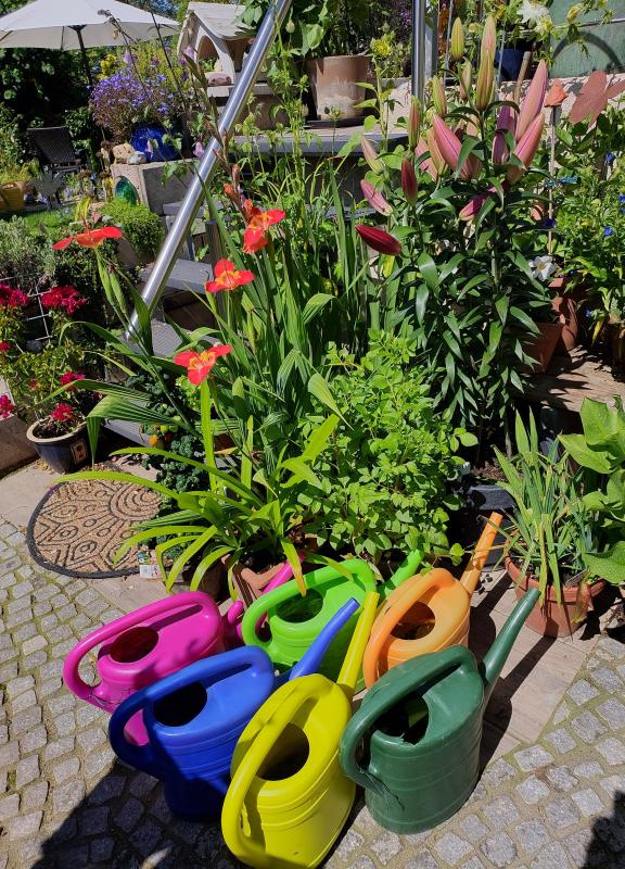 Am Aufgang zur Terrasse ein aus Platznot unbeabsichtigtes buntes Durcheinander ;D. Pinke Bougainville, rote Tigrida, lachsfarbene Gladiolen. In dem Kübel haben sich Vogelfutter-Sonnenblumen und Hibiscus Canabinus ausgesät. Lila Ceratethoca triloba, allerlei Blaues und die 3 Baumlilien in verschiedenen Farben müssten auch mal blühen. Die Giesskannen mit Regenwasser werde ich heute benötigen.