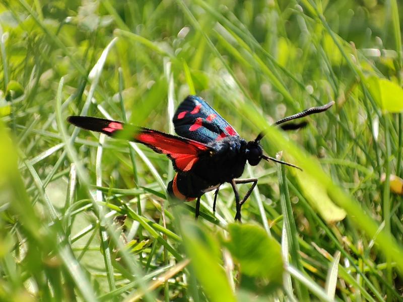 Ein Waldbrettspiel sah ich im Zweitgarten auch schon. Heute: Kohlweißlinge, Zitronenfalter, Schachbrettfalter, C-Falter, Tagpfauenauge, usw. und dann sah ich im Gras plötzlich ein Widderchen, wahrscheinlich ein Sechsfleck-Widderchen/ Zygaena filipendulae.