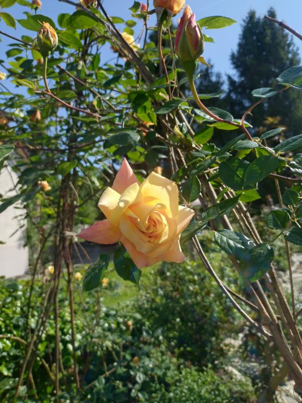 Unten Climbing Sutters Gold, die macht mir grad grosse Freude und strahlt durch den ganzen Garten (am lächerlichen Weidenbogen - muss mir da was überlegen...)