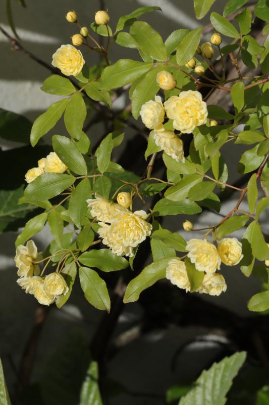 Die erste Rose blüht in meinem Garten: banksiae var. lutea. :)