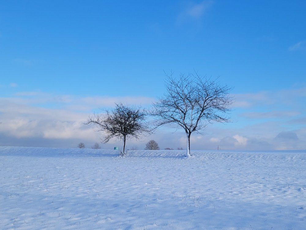 Spaziergang bei etwa + 1 Grad, trocken mit teilweise blauem Himmel bei sonnigen Abschnitten, etwas oberhalb unseres Ortes. Winter von seiner schönsten Seite.
