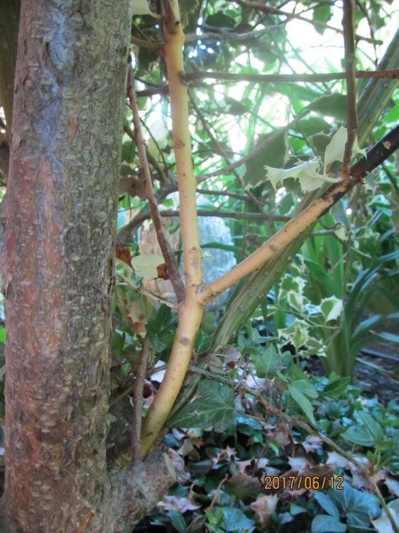 Seit einiger Zeit beobachte ich an meinem alten weißbunten Ilex einen Trieb, der direkt aus dem Boden neben dem Hauptaustrieb kommt. Dieser Trieb hat fast transparente Zweige und völlig weißes Laub. Ich finde das aktuell nervig, weil er den Gesamteindruck des Strauches stört, der Trieb ist so weit drinnen, daß ich ihn nicht gut völlig entfernen kann.