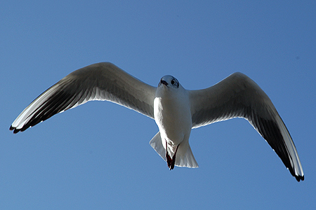 Hier nochmal die Nordsee:Zuerst eine Lachmöwe mit Knick-Flügeln ... aber nicht startend, sondern einschwebend ...