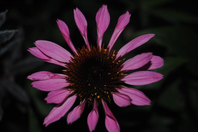 Echinacea paradoxa. Von den ca. hundert Samen, die ich letztes Jahr ausgelegt hatte, war genau einer gekeimt. Diese Pflanze hat in diesem Jahr zwei Blüten geschoben. Mühsam ernährt sich das Eichhörnchen ...