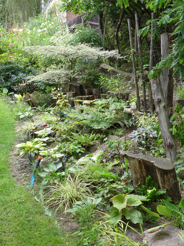 Nach etwa sechs Wochen sieht das Stubbenbeet schon ganz nett aus. Astilbe 'Chocolate Shogun' ist trotz fleißigen Gießens bei Temperaturen jenseits der 30 Grad zusammengebrutzelt. Alles andere entwickelt sich ganz gut. Inzwischen sind auch etliche Galanthus ins Beet gekommen.