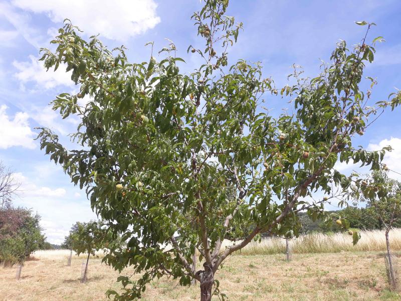 Auch der Gelbe Rheinsteig Pfirsich Foto noch unreif reift E8 (gelbfleischig wie Lehnerts) hat später noch ok getragen auf jeden Fall in Summe besser als Später Traditionspfirsich A9, der nicht nur am Frühjahrstrieb sondern auch an den Früchten stärker Monilia hatte. Beide sind auf Pflaumenunterlage doppelt so starkwüchsig wie Lehnerts.
