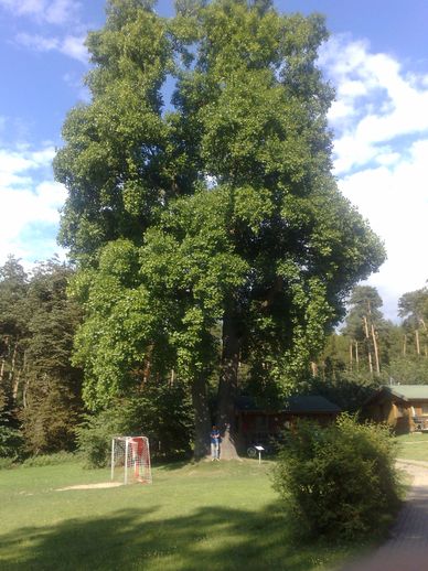 Der Tulpenbaum wächst in der Nähe von Malchow auf dem Gelände eines Hotels (Wessin) . Der Baum ist 34 m Hoch und hat einen Kronendurchmesser von 16 m.Eigentlich sollte ich das Foto unserer Führerin in Tharandt schicken. Aber ich hatte nichts zum Schreiben dabei. Das Mitglied das es hat wollte mir die Adresse schicken. Das Gesicht habe ich abgespeichert aber den Namen leider nicht. Na ja hier das Bild des Prachtexemplars. Die Gestalt am Fuß des Riesen bin ich.