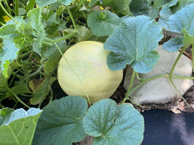 Die anderen immer angebauten Sorten sind auch zeitlich hinterher. Die koreanischen Chamoe-Melonen kommen als nächstes, werden gelb. Und dann offenbar "Mangomel", eine verbreitete Sorte. Kleine Honigmelone die durch kräftiges Wachstum und guten Fruchtansatz überrascht. F1-Hybride, leider.