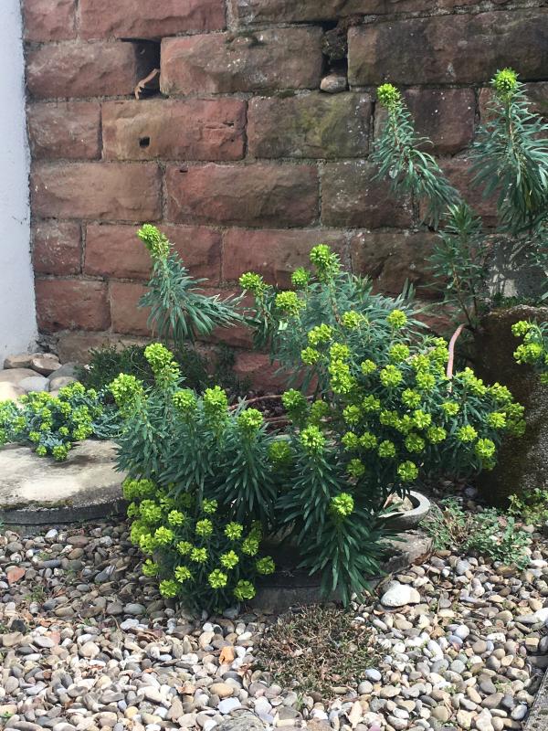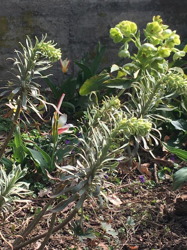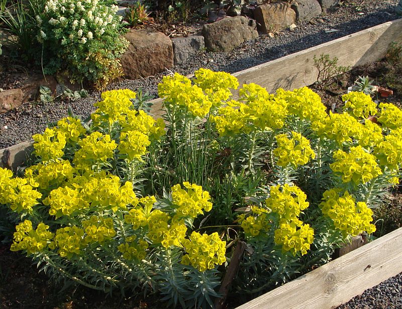 Wenn die Euphorbien im Frühling blühen, habe ich immer das Gefühl, es sei Sommer. myrsinites mit characias, die inzwischen sehr ausladend geworden ist. Mehr liegend als stehend inzwischen die Madame, aber es ist ja zum Glück genug Platz.
