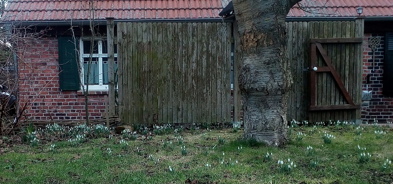 Hier leuchtet es so langsam in immer größeren Teilen weiß. Wenn ich planmäßig den Staudenrückschnitt geschafft hätte, wären das schon ansehnliche Flächen, momentan ist der Blick da noch etwas gebremst. :(