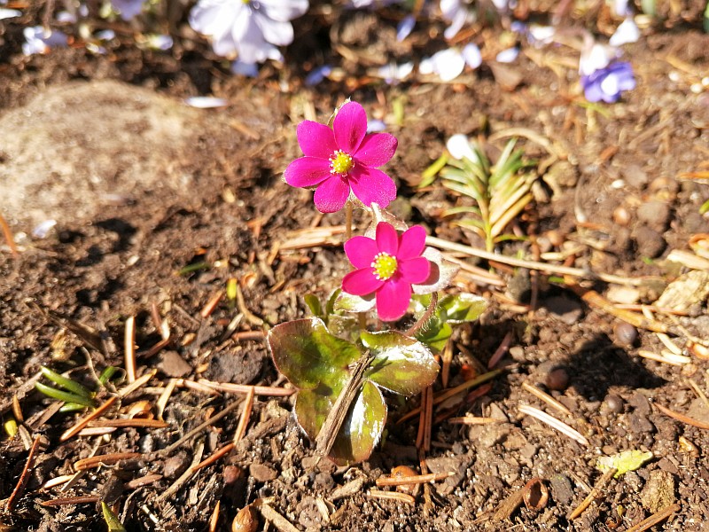 Unser alter Apfelbaum wird am Stammfuß von Leberblümchen umkränzt. Diese Linie haben sie sich als Sämlinge fast völlig erobert.