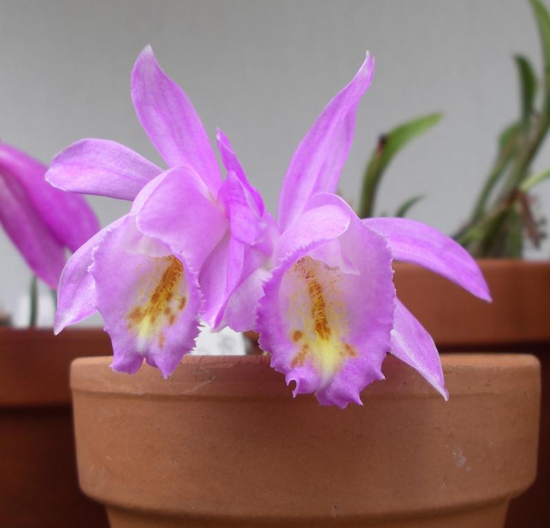 Sie hat zwei Blüten offen und zwei Knospen in Entwicklung, d. h. wenn alles klappt, werden es vier Blüten.Re:Pleionen - drinnen und draußen