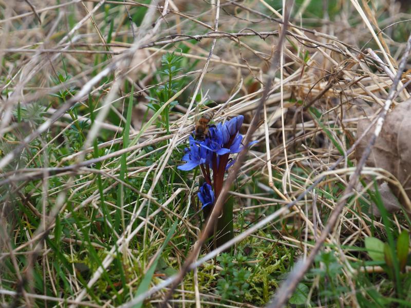 ein fettes Blausternchen, Scilla bifolia, im Heu der noch nicht abgeräumten Pflanzung mit Biene drauf und drum rum.