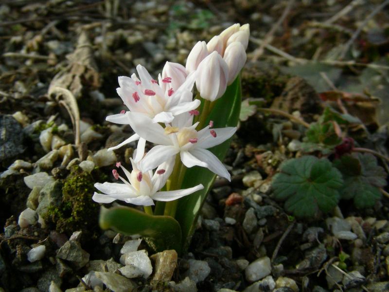 Ich hab jetzt noch einen Leckerbissen. Ein Scilla bifolia in weiß mit blauen Staubgefäßen. Tatsächlich hat es bis jetzt überlebt und blüht! Richtig aufregend!