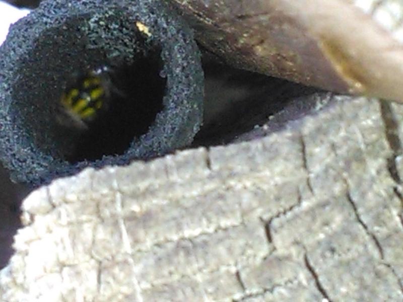 Ein undichtes Stück Tröpfelschlauch habe ich ins Wildbienenhaus gelegt. Nach einer halben Stunde war es bezogen, allerdings von etwas schwarz/gelbem. (Weil es so viele von denen hier gibt, vermutlich Gallische Feldwespe.) Aber genaugenommen konnte ich nur das Hinterteil sehen.
