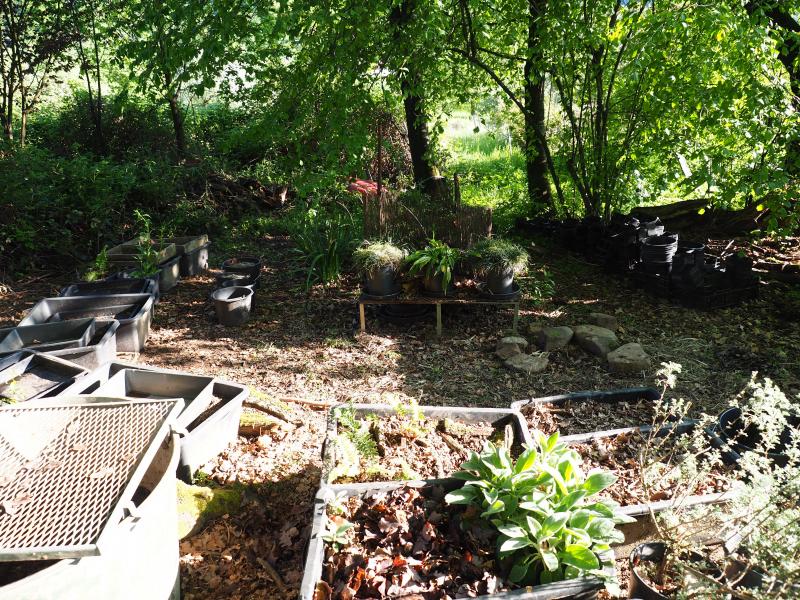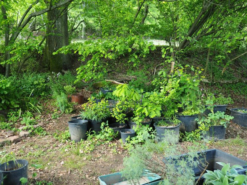 das ist nur der untere Teil, im oberen Teil stehen die runden Kübel mit den Gehölzen in Vorkultur und sind jetzt ergänzt worden durch ein paar mehr runde Kübel mit Frühjahrsblühern. Schätze, die ich in den letzten Tagen und Wochen bekommen habe.