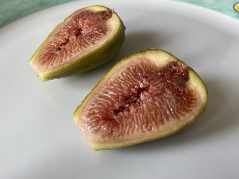 Die gestrige RdB habe ich zu früh gepflückt. War deshalb die schlechteste aller 2020er Feigen (Negronne, Brown Turkey, Firoma, falsche Brogiotto Nero). Dachte wegen der Risse in der Haut ist sie reif, dem war aber nicht so.