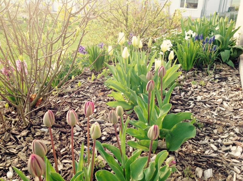 Tulipa "Lilac wonder" hatte ich ursprünglich als Kennzeichnung um eine neugepflanzte "Jan van Leeuwen" (Die noch nicht zu sehen ist) gepflanzt. Aus dem 10er Pack ist eine ordentliche Zahl geworden. Im Hintergrund Iberis sempervirens.
