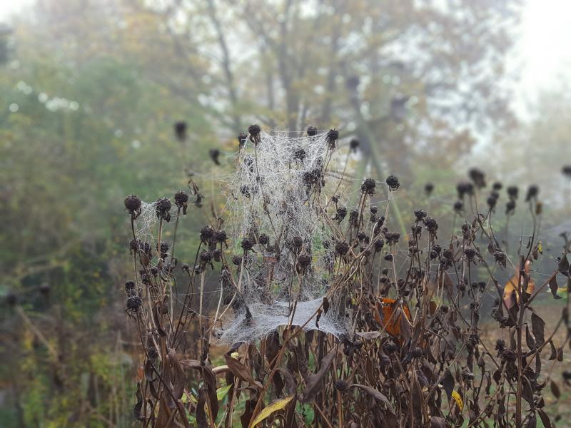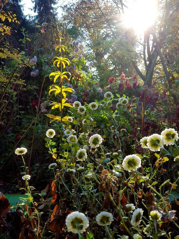 Die herbstliche Morgensonne durchdringt den auch im verblühten Zustand noch imposanten Kandelaberehrenpreis sowie