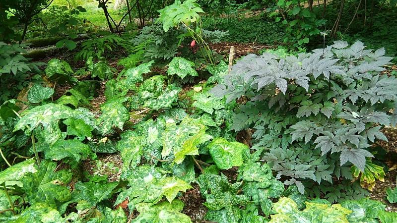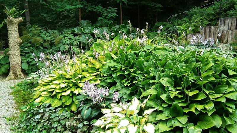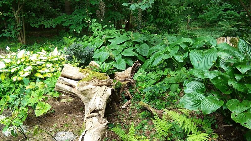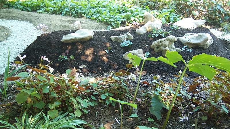 Links neben dem Eingang in den Waldgarten hab ich eine Fläche von ca 25qm, auf der bisher Straußenfarn gewuchert hat, gerodet. Mit Sand und Lauberde den Lehmboden verbessert, und das ist dann entstanden.