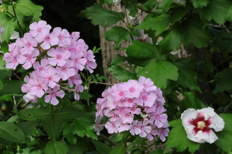 'Spätsommer' im Schatten, jetzt voll erblüht. Später blüht von unseren Phloxen nur 'Herbstwalzer'. 'Alena' von Händel ist noch später, musste aber wohl neu durchtreiben und windet sich ein wenig am Boden.